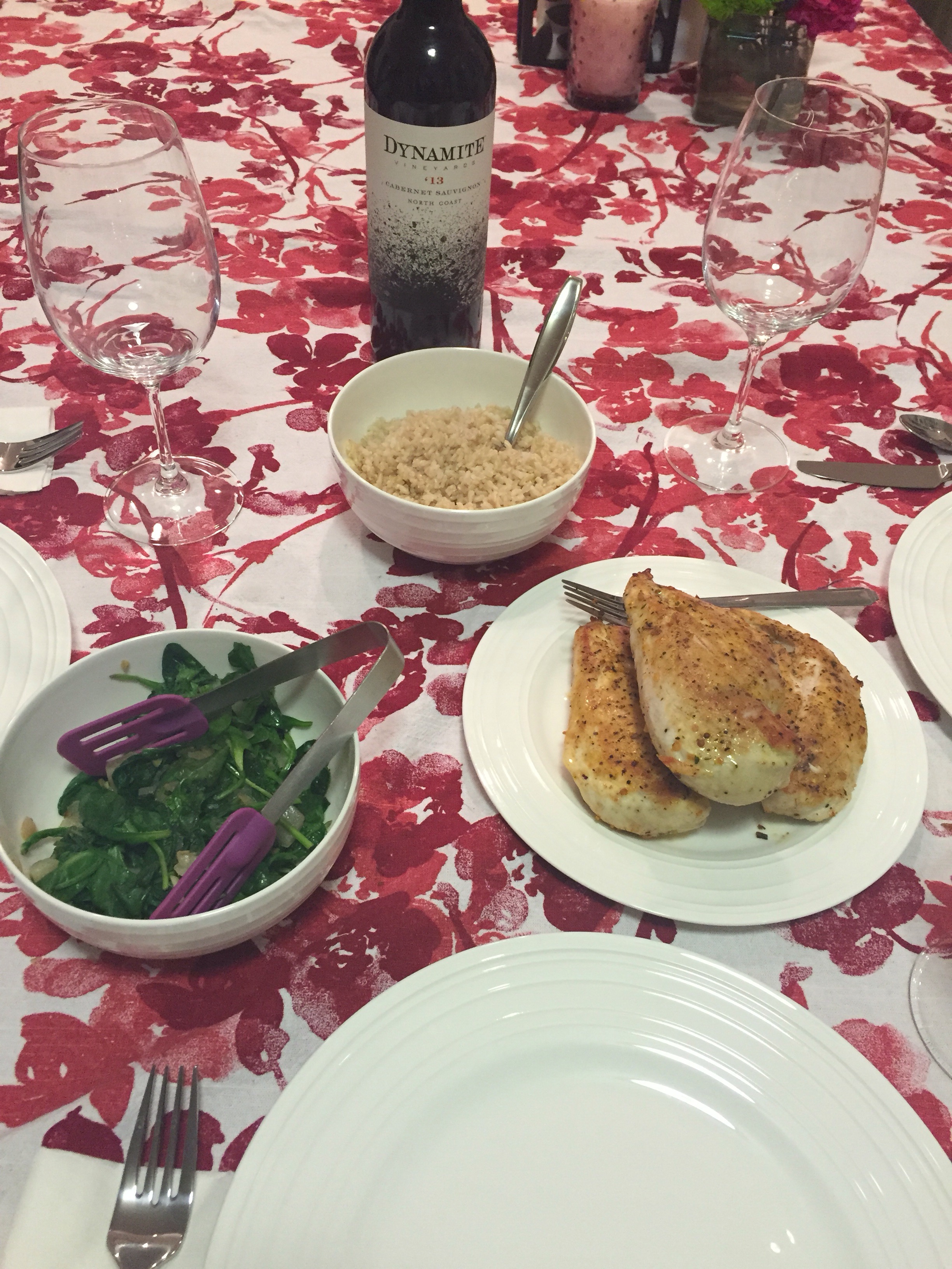 So I know I’m not alone in saying that I AM TIRED when I get home from work… The last thing I want to do when I get home is cook dinner. Having dinner with my husband is one of the highlights of my day but actually cooking it, oy. So I try to make the easiest, least time consuming but absolutely delicious and healthy meals I can come up with every night. This is definitely one of them- seasoned chicken, sautéed arugula and spinach, and brown rice.